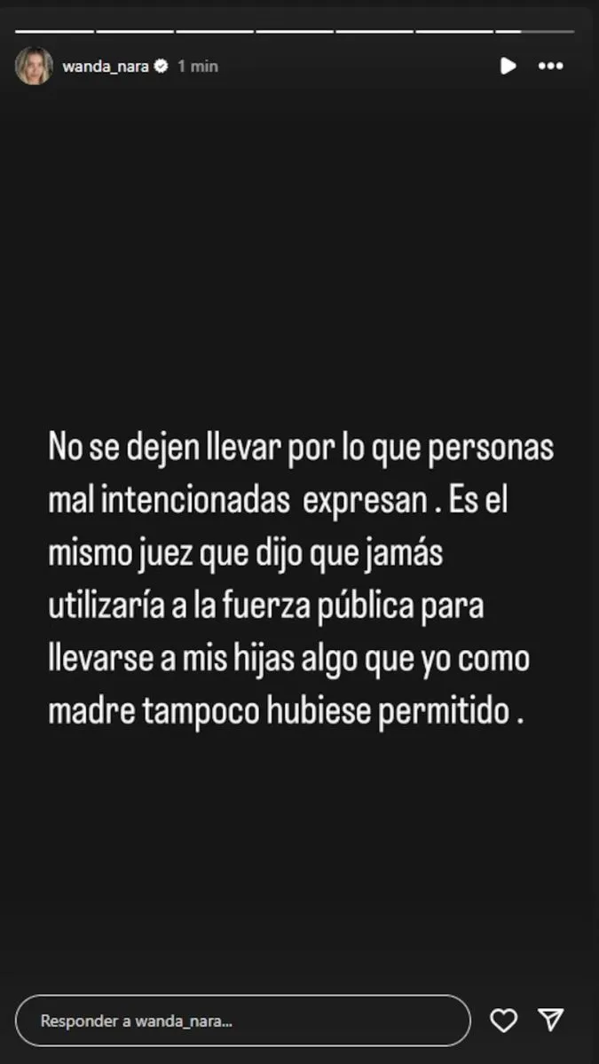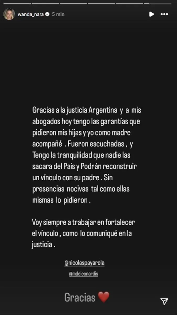 A través de sus historias de Instagram, Nara se refirió a la decisión y destacó que la medida se tomó bajo ciertas condiciones: “Gracias a la justicia Argentina y a mis abogados, hoy tengo las garantías que pidieron mis hijas y yo, como madre, acompañé”, expresó. También remarcó que las niñas fueron escuchadas y que la resolución asegura que: "nadie las sacará del país y podrán reconstruir un vínculo con su padre. Sin presencias nocivas, tal como ellas mismas pidieron”.