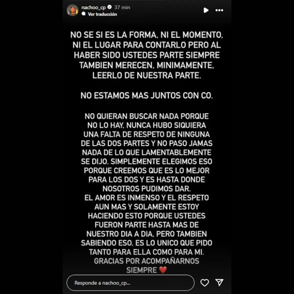 “No sé si es la forma, ni el momento, ni el lugar para contarlo, pero al haber sido ustedes parte, siempre también merecen, mínimamente, leerlo de nuestra parte. No estamos más juntos con Co”, comenzó el comunicado de Nacho en su cuenta personal de Instagram.