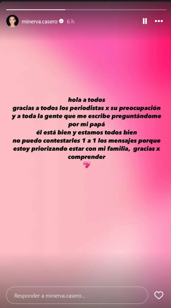 "Hola a todos. Gracias a todos los periodistas por su preocupación y a toda la gente que me escribe preguntándome por mi papá", escribió Minerva. Y agregó: "Él está bien y estamos todos bien, no puedo contestarles uno a uno los mensajes porque estoy priorizando estar con mi familia. Gracias por comprender".