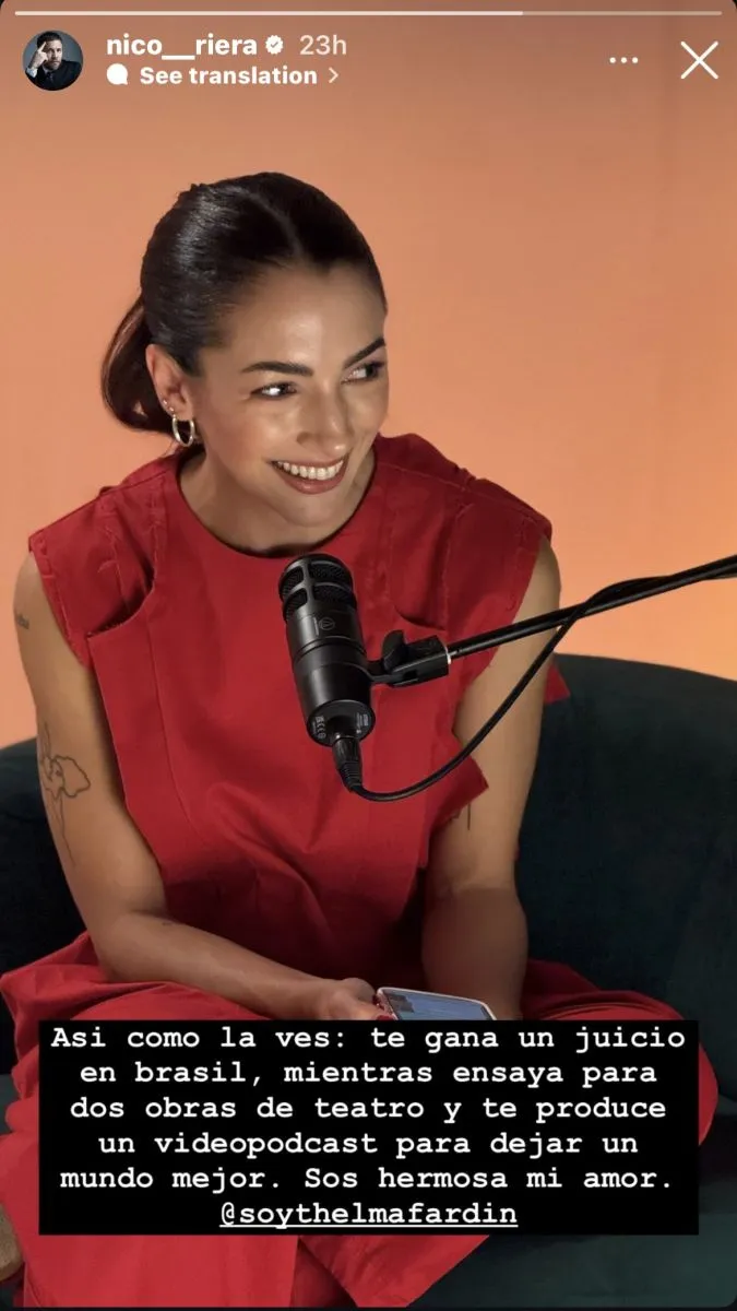 "Así como la ves: te gana un juicio, mientras ensaya para dos obras de teatro y te produce un videopodcast para dejar un mundo mejor. Sos hermosa mi amor", escribió Riera, acompañando sus palabras con una foto de Thelma.