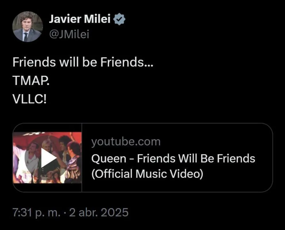 El mandatario Javier Milei reaccionó este miércoles a la decisión de Donald Trump de aplicar un 10% de arancel a los productos argentinos. Lejos de mostrar preocupación, el libertario compartió en sus redes sociales un mensaje breve pero contundente: "Todo marcha acorde al plan".Junto a la frase, el presidente publicó el videoclip de Friends Will Be Friends, de Queen. Sin embargo, la elección de la banda británica en el aniversario de la Guerra de Malvinas generó polémica en redes sociales.