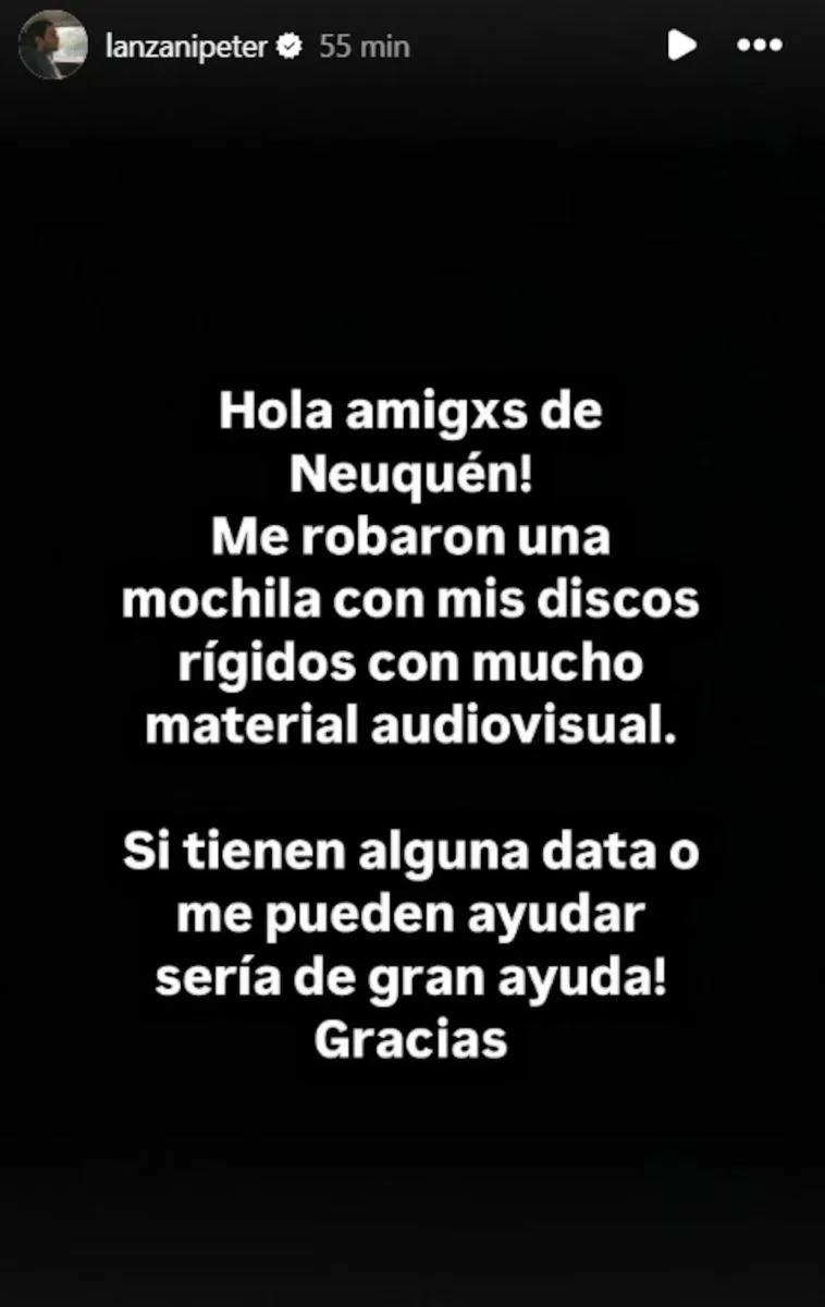Peter Lanzani fue víctima de un robo mientras se encontraba en Neuquén. A través de sus redes sociales, el actor hizo un pedido desesperado para intentar recuperar una mochila que contenía material de gran valor para él.