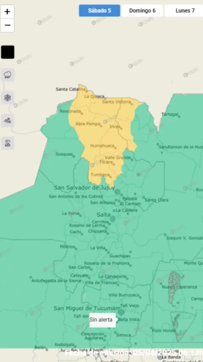 Las provincias de Jujuy y Salta se encuentran bajo alerta amarilla por tormentas, con probabilidad de actividad eléctrica: “Se prevén valores de precipitación acumulada entre 20 y 40 mm, que pueden ser superados en forma puntual”, informó el SMN.
