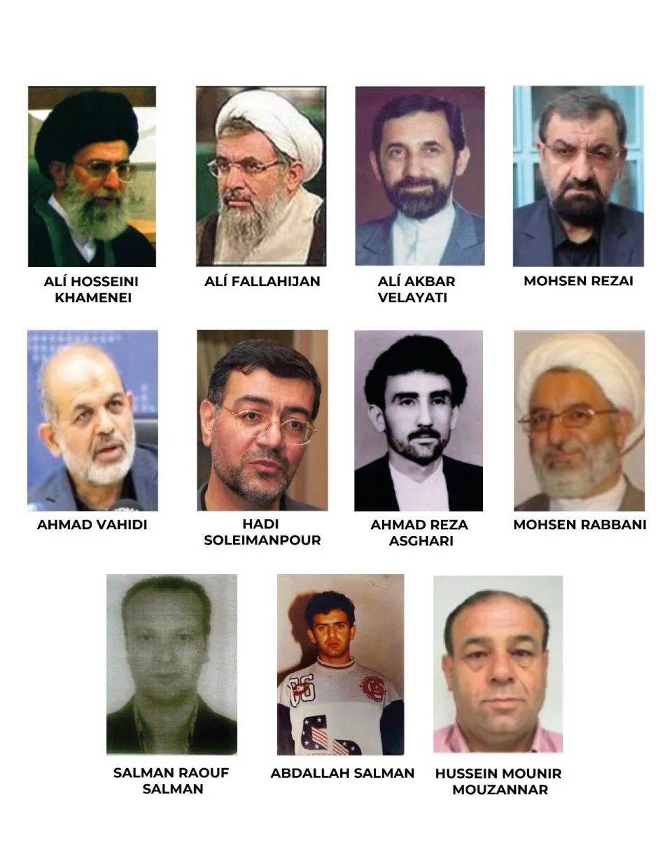 Entre los acusados figuran altos exfuncionarios y diplomáticos iraníes como Alí Fallahijan, Mohsen Rezai, Alí Akbar Velayati y Ahmad Vahidi, todos con alertas rojas de Interpol vigentes desde 2006. Sin embargo, la falta de colaboración de Irán, que no extradita a sus ciudadanos, sumada a la escasa efectividad de las alertas durante sus viajes internacionales, ha impedido cualquier avance en sus detenciones.