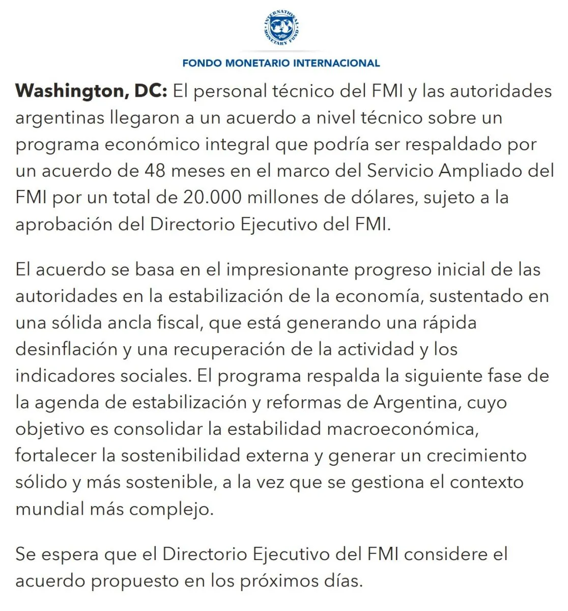 “El personal técnico del FMI y las autoridades argentinas han llegado a un acuerdo a nivel de personal técnico sobre un programa económico integral que podría respaldarse con un acuerdo de 48 meses en el marco del Servicio Ampliado del FMI (SAF) por un total de 20.000 millones de dólares estadounidenses (15.267 millones de DEG o el 479% de la cuota), sujeto a la aprobación del Directorio Ejecutivo del FMI”, informó el organismo a través de un comunicado.