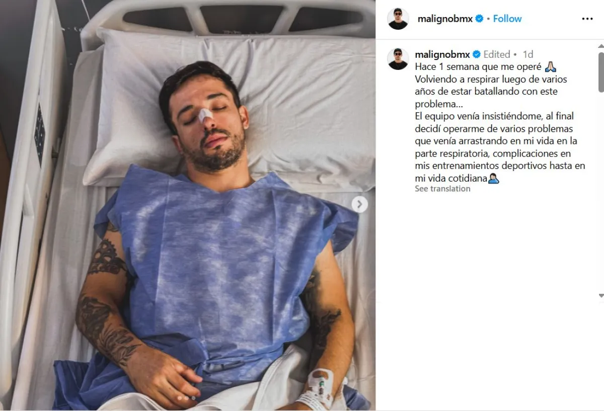 “Hace una semana que me operé. Volviendo a respirar luego de varios años de estar batallando con este problema…”, escribió el ciclista en su perfil, acompañando el mensaje con fotos en la clínica y un video en el que se lo ve en pleno proceso de limpieza nasal, con los orificios llenos de sangre.