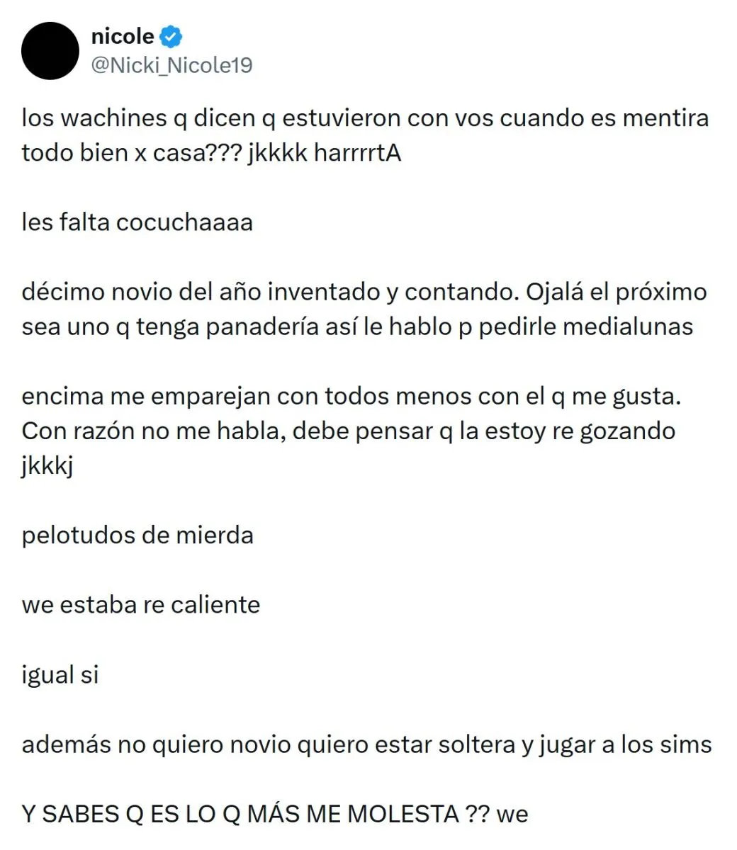 Lejos de mantenerse en silencio, Nicki continuó expresando su descontento en redes sociales. En otro de sus posteos más replicados comentó: “Encima me emparejan con todos menos con el que me gusta. Con razón no me habla. Debe pensar que la estoy re gozando”. Y más adelante reafirmó su deseo de mantener la soltería: “Además, no quiero novio, quiero estar soltera y jugar a Los Sims”.