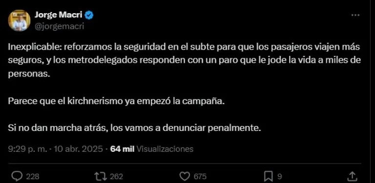 Desde el Gobierno porteño, Jorge Macri expresó su postura a través de su cuenta en X (ex Twitter): “Reforzamos la seguridad en el subte para que los pasajeros viajen más seguros, y los metrodelegados responden con un paro que le jode la vida a miles de personas. Parece que el kirchnerismo ya empezó la campaña”, escribió, y advirtió que, si no se revierte la medida, el Ejecutivo avanzará con una denuncia penal.