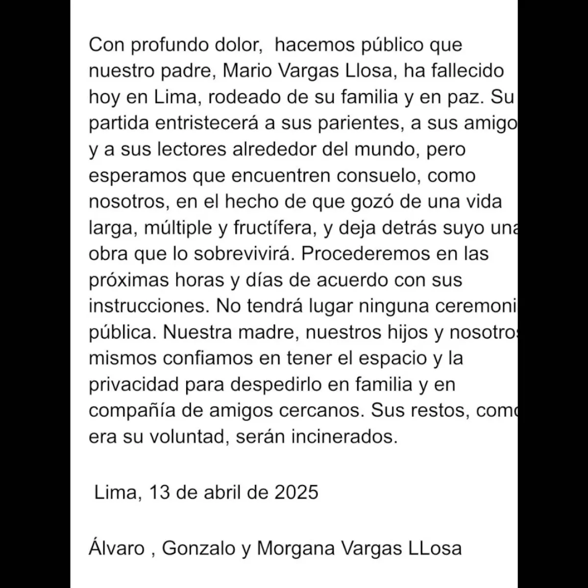 En el mensaje firmado por Álvaro, Gonzalo y Morgana Vargas Llosa, sus hijos destacaron que el escritor tuvo una vida “larga, múltiple y fructífera”. Aunque lamentaron su pérdida, señalaron que hallan consuelo en la trascendencia de su obra, que ha dejado una huella profunda en la literatura universal.