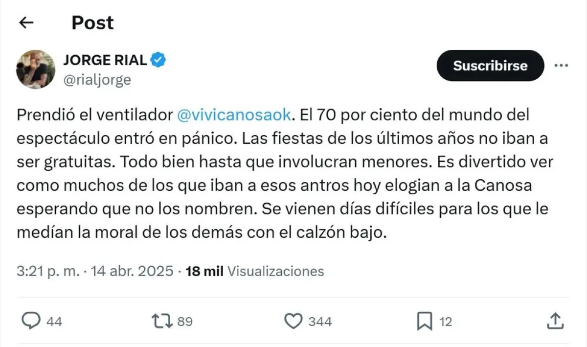 Ante este panorama, Jorge Rial escribió en redes: “La bomba de @vivicanosaok tiene a muchos nerviosos. Si cuenta todo lo que adelantó sobre fiestas, alcohol y menores, varios integrantes de la farándula se van a ver en problemas. Muchos pasando el límite de un delito. Vean a todos los que hablan. Bueno, busquen por ahí”.