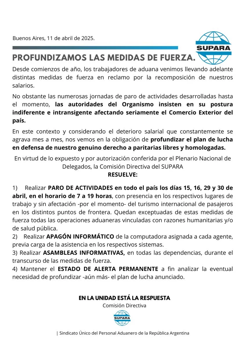 "Desde comienzos de año, los trabajadores de aduana venimos llevando adelante distintas medidas de fuerza en reclamo por la recomposición de nuestros salarios", comienza diciendo el comunicado.