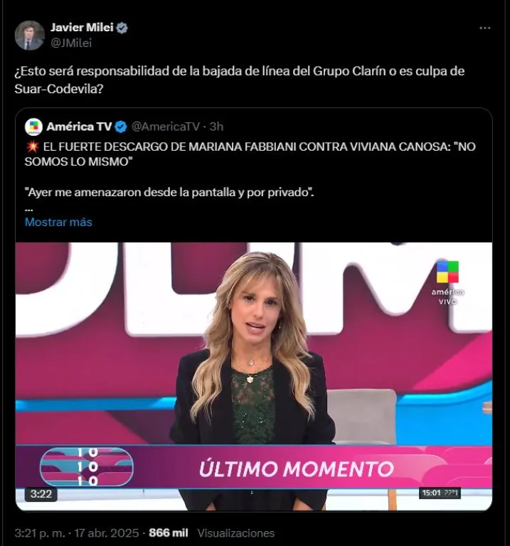 Javier Milei se viralizó luego de un tuit en el cual apoyó a Mariana Fabbiani y criticó a Viviana Canosa, escribió: “¿Esto será responsabilidad de la bajada de línea del Grupo Clarín o es culpa de Suar-Codevila?”, apuntando directamente contra El Trece.