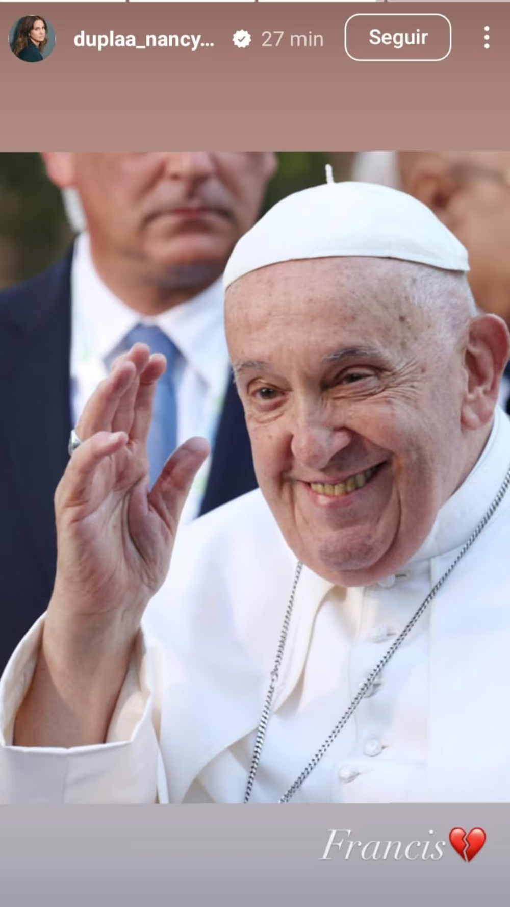 Nancy Dupláa, por su parte, eligió la simpleza para transmitir su pesar. Subió una imagen del Papa acompañada de la palabra “Francis” y un emoji de corazón roto, lo que reflejó la conmoción que la noticia provocó en muchos argentinos. Desde un perfil muy distinto, el músico L-Gante también compartió una despedida: una foto en blanco y negro del Papa junto a las siglas “QEPD”. Su posteo fue rápidamente viralizado, y muchos de sus seguidores destacaron el espíritu humilde y cercano de Francisco, algo que el artista suele valorar.