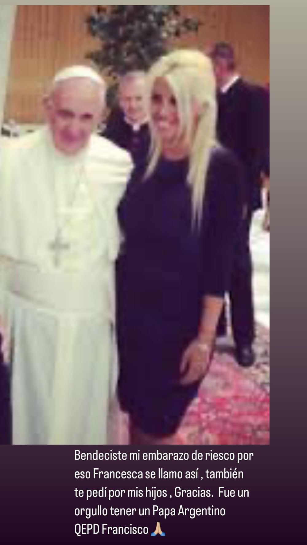 Wanda Nara fue una de las primeras en expresar su dolor a través de un mensaje íntimo y significativo. Compartió una foto con el Papa y recordó una experiencia personal: “Bendeciste mi embarazo de riesgo, por eso Francesca se llamó así. También te pedí por mis hijos, gracias”, escribió, haciendo alusión a la paz que sintió durante una audiencia privada en el Vaticano. Su hija mayor lleva ese nombre en honor al pontífice.
