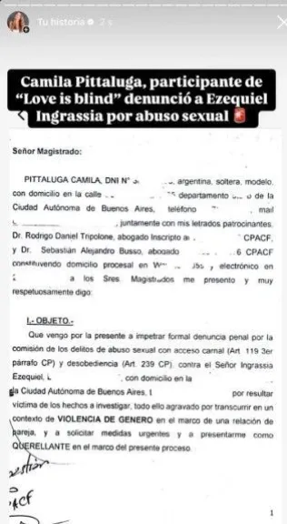 Después de que Emily Ceco hiciera pública una denuncia contra Santiago Martínez por violencia de género, otra exintegrante del reality Love is Blind se vio envuelta en una situación judicial, Camila Pittaluga denunció a Ezequiel Ingrassia por presunto abuso sexual.
