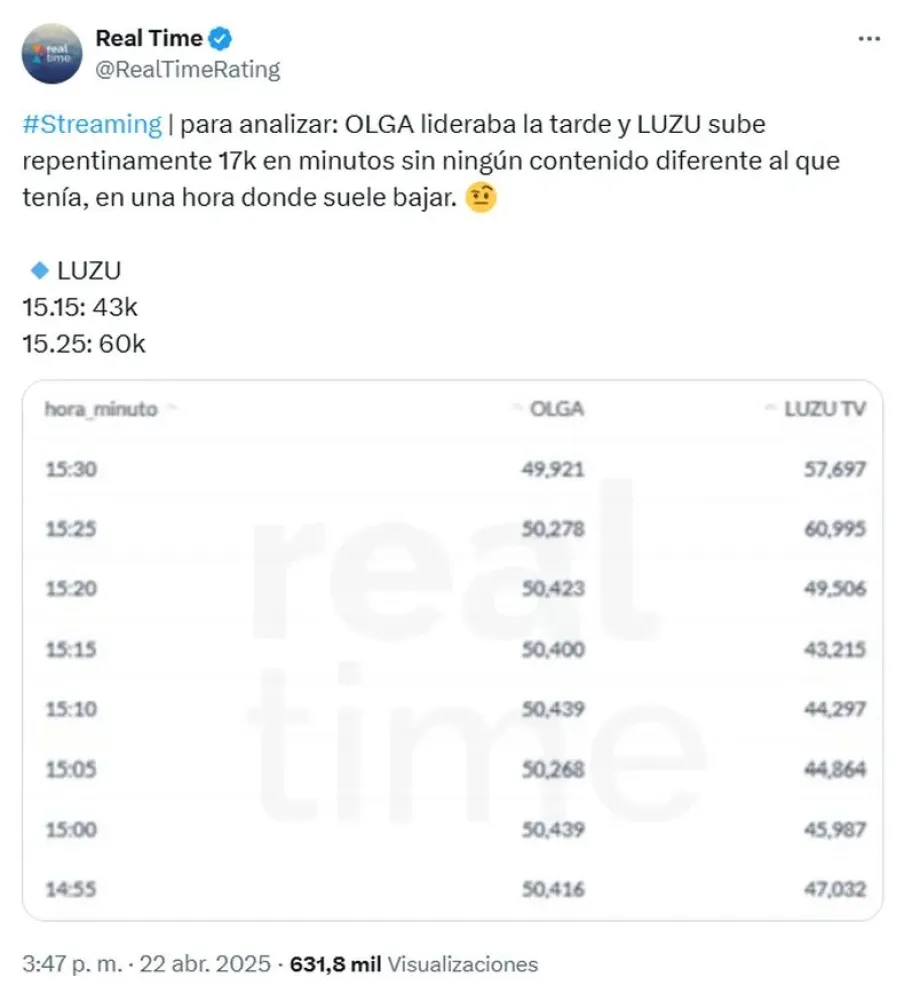 Desde la cuenta @realtimerating en X (ex Twitter), se mostraron los números que alcanzaron los canales durante la tarde, y lo que más llamó la atención fue el incremento de 17 mil visualizaciones en Luzu TV en tan solo un minuto.