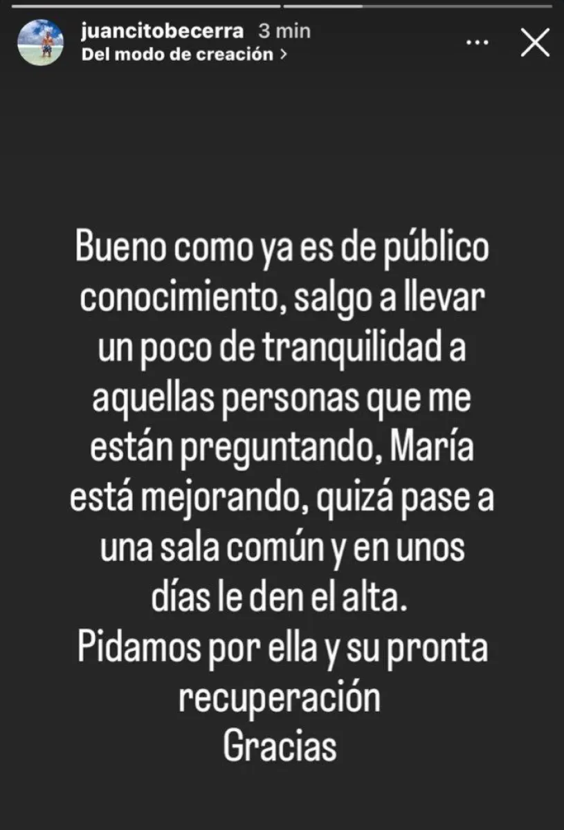 “María está mejorando, quizá pase a una sala común y en unos días le den el alta. Pidamos por ella y su pronta recuperación. Gracias”, concluyó, brindando un mensaje esperanzador sobre el estado de salud de su hermana.