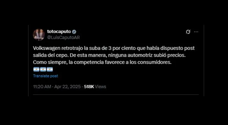 Luis Caputo celebró que "ninguna automotriz subió precios" tras la salida del cepo
