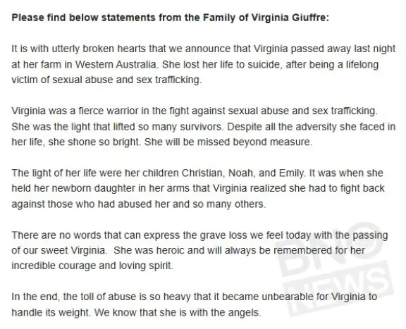 “Con el corazón destrozado, anunciamos que Virginia falleció anoche en su granja en Australia Occidental”, indicaron sus seres queridos en un comunicado difundido por medios estadounidenses. “Perdió la vida por suicidio, después de haber sido víctima de abuso sexual y tráfico sexual durante toda su vida”, agregaron.