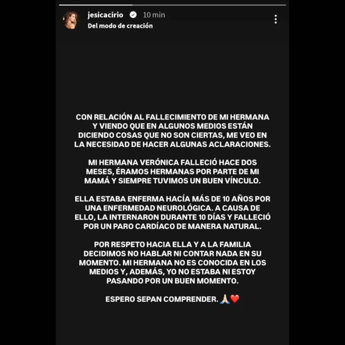 A través de una historia de Instagram, Jesica compartió: “Con relación al fallecimiento de mi hermana y viendo que en algunos medios están diciendo cosas que no son ciertas, me veo en la necesidad de hacer algunas aclaraciones”. Luego, detalló: “Mi hermana Verónica falleció hace dos meses. Éramos hermanas por parte de mi mamá y siempre tuvimos un buen vínculo”. Además, explicó que Verónica atravesaba una enfermedad neurológica desde hacía más de diez años, y que, tras estar internada diez días, falleció naturalmente a causa de un paro cardíaco.