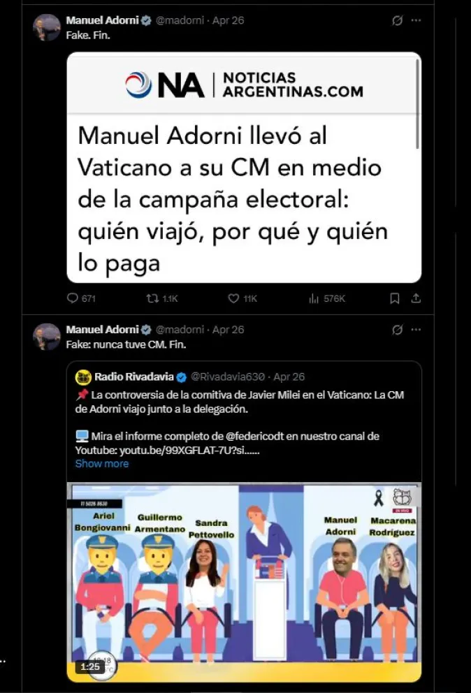 La aparición de Rodríguez en el vuelo oficial genera un fuerte debate público. Es que hubo días atrás una fuerte controversia en la que Adorni negó tener una community manager y calificó esas versiones como “fake news”, pero sin confirmar ni desmentir explícitamente la presencia de la joven funcionaria en la delegación oficial que viajó a Roma.