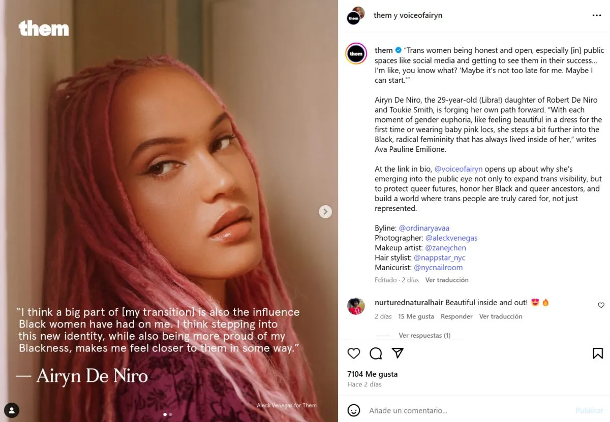 Airyn mencionó que figuras como Laverne Cox la inspiraron a dar este paso: “El hecho de que las mujeres trans sean honestas y abiertas, especialmente en espacios públicos como las redes sociales, y verlas en su éxito. Me pregunto: '¿Sabes qué? Quizá no sea demasiado tarde para mí'”.