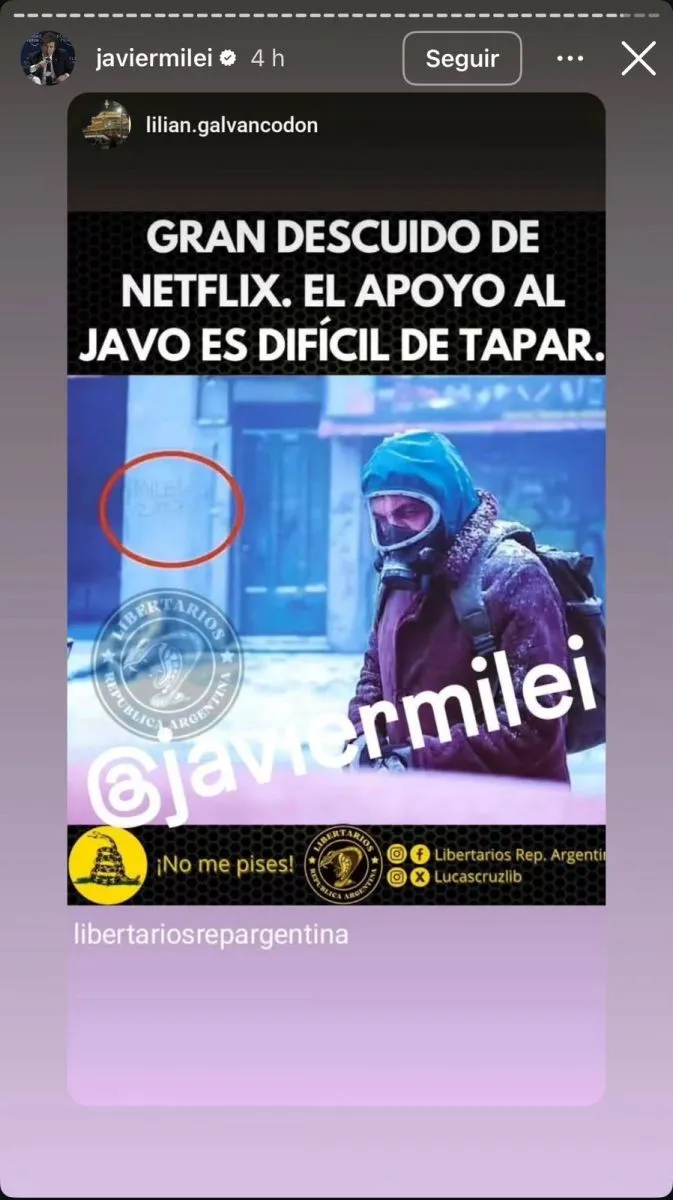 Este martes, Javier Milei difundió en su cuenta de Instagram una captura alterada de El Eternauta en la que se ve un grafiti que dice "Milei 2027". La imagen, que rápidamente se viralizó, no corresponde a la foto auténtica de la serie.