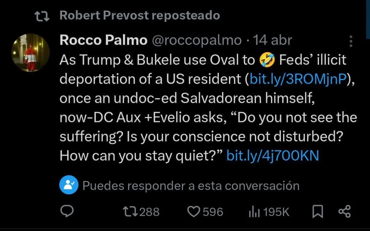 Prevost, de 69 años y nacido en Chicago, retuiteó por última vez el 14 de abril, apenas días antes de ser elegido pontífice por el Cónclave en la Capilla Sixtina. En esa ocasión, compartió un mensaje del comentarista católico Rocco Palmo, quien denunciaba la colaboración de Trump con el presidente salvadoreño Nayib Bukele para deportar migrantes. El mensaje citaba al obispo auxiliar Evelio Menjivar preguntando: “¿No ven el sufrimiento? ¿No se perturba su conciencia?”.