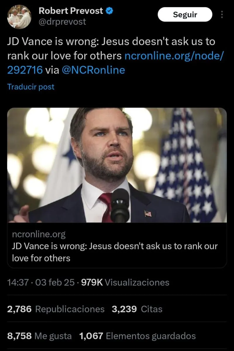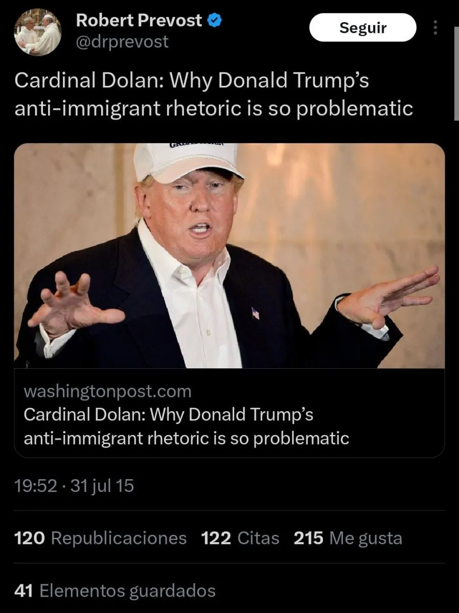 Durante el primer mandato de Trump, Prevost ya había expresado posturas críticas. En 2017, compartió un tuit del arzobispo de Chicago, Blase Cupich, quien describía los vetos a refugiados como “una hora oscura en la historia de Estados Unidos”. También difundió un mensaje del sacerdote jesuita James Martin, que calificaba como inmoral la decisión de prohibir el ingreso de refugiados sirios, lamentando que “Jesús llora” ante esa realidad.
