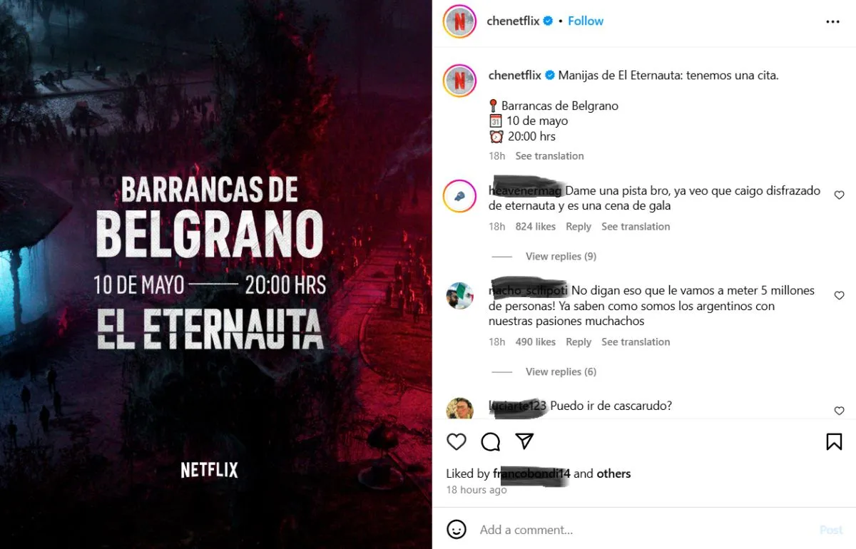 En las últimas horas y con todas las repercusiones no solo a nivel local sino también internacional del estreno de la serie El eternauta, desde el Instagram de Netflix dejaron una cita para los fans, a quienes se los invoca como "manijas de El Eternauta".