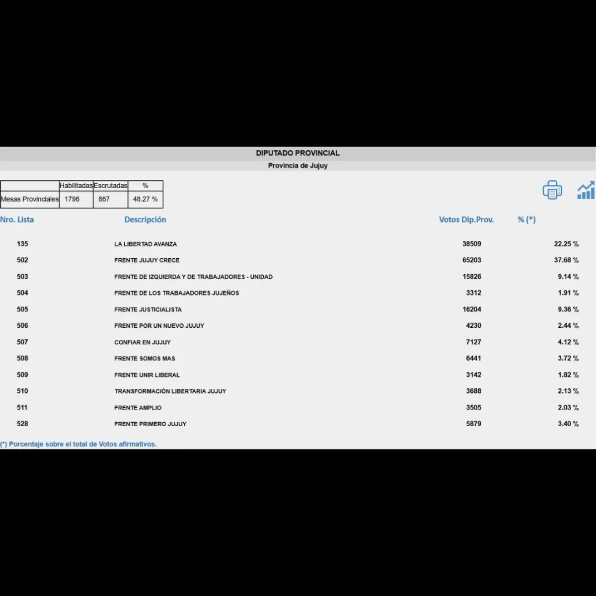 El oficialismo de Jujuy, encabezado por la coalición Jujuy Crece, logró una clara victoria en las elecciones legislativas de 2025. Con el 48.27% de las mesas escrutadas, el espacio liderado por el gobernador Carlos Sadir se imponía con el 37.68% de los votos, mientras que La Libertad Avanza quedaba en segundo lugar con el 22.25%. El Frente Justicialista quedó relegado a un distante tercer puesto con el 9.36%.