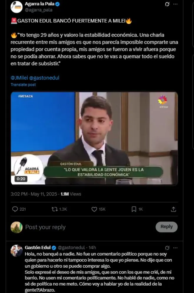 Este domingo, Gastón Edul fue uno de los invitados a la mesa de Juana Viale. Allí, el periodista habló de todo, sin embargo, parte de su relato no pasó desapercibido y generó un gran revuelo en las redes sociales. A raíz de esta situación, un medio libertario levantó el recorte y aseguró que Edul apoyaba al gobierno de Javier Milei. Ante esto, el periodista deportivo no dudó en salir a desmentir la información y desactivó todo tipo de especulaciones. "Yo tengo 29 años y valoro la estabilidad económica. Una charla recurrente entre mis amigos es que nos parecía imposible comprarte una propiedad por cuenta propia, mis amigos se fueron a vivir afuera porque no se podía ahorrar. Ahora sabes que no te vas a quemar todo el sueldo en tratar de subsistir", había dicho Edul. "Gastón Edul bancó fuertemente a Milei", dice el posteo, que estuvo acompañado por las declaraciones que había hecho el periodista en Almorzando con Juana. Al ver esto y la repercusión que estaba teniendo, Gastón no dudó y respondió el posteo de forma contundente, despejando todo tipo de dudas. "Hola, no banqué a nadie. No fue un comentario político porque no soy quien para hacerlo ni tampoco interesa lo que yo piense", comenzó diciendo.