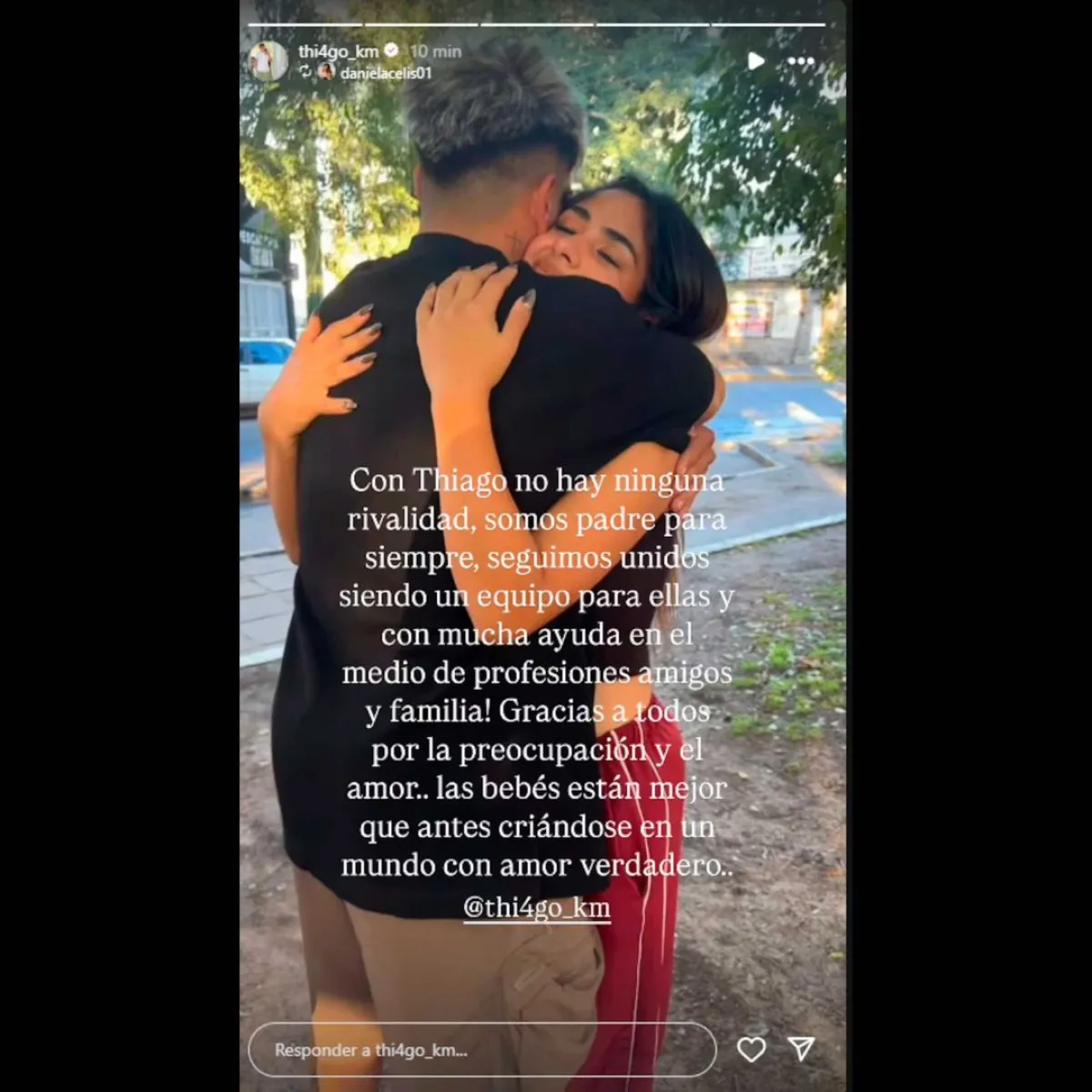 “Con Thiago no hay ninguna rivalidad, somos padres para siempre, seguimos unidos siendo un equipo para ellas”, expresó la joven en una historia publicada en su cuenta de Instagram. En la misma publicación, Daniela destacó que ambos están contando con el apoyo de profesionales, amigos y familiares para atravesar esta nueva etapa. “Con mucha ayuda en el medio de profesionales, amigos y familia”, agregó.