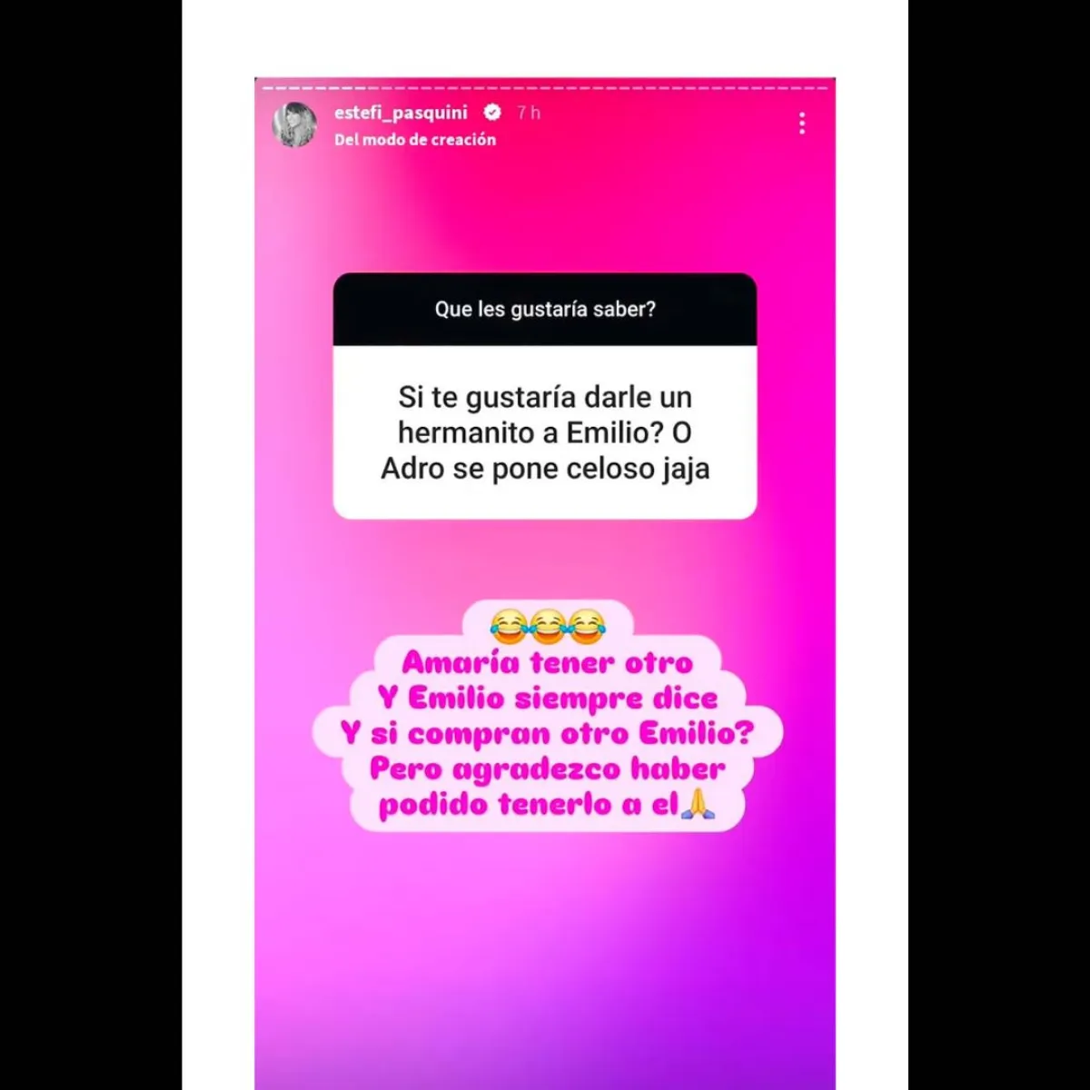 La interacción se produjo cuando Pasquini habilitó una caja de preguntas y respuestas. Entre las numerosas consultas, una en particular llamó la atención. “¿Te gustaría darle un hermanito a Emilio o Adro se pone celoso?”, le escribió un usuario, en referencia a su pequeño hijo y su mascota. Sin dudar, Estefanía respondió: “Amaría tener otro”. Además, compartió una divertida anécdota: “Emilio siempre dice ‘¿y si compran otro Emilio?’”.