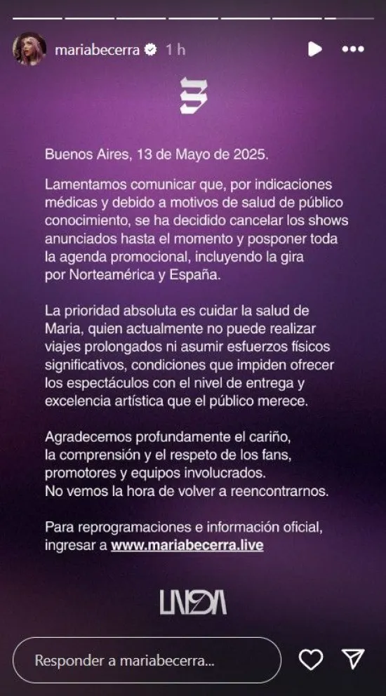 “Lamentamos comunicar que, por indicaciones médicas y debido a motivos de salud de público conocimiento, se ha decidido cancelar los shows anunciados hasta el momento y posponer la gira promocional, incluyendo la gira por Norteamérica y España”, informó el comunicado que difundió la cantante.