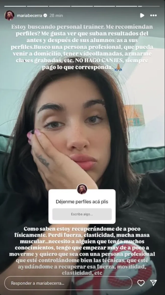 Becerra también se dirigió directamente a sus seguidores en otra historia de Instagram, pidiéndoles recomendaciones de personal trainers. “Como saben, estoy recuperándome de a poco físicamente. Perdí fuerza, elasticidad, mucha masa muscular… necesito alguien que tenga muchos conocimientos, tengo que empezar muy de a poco a moverme y quiero que sea con una persona profesional que esté ayudándome a recuperar esa fuerza, movilidad, elasticidad, etc.”, escribió.