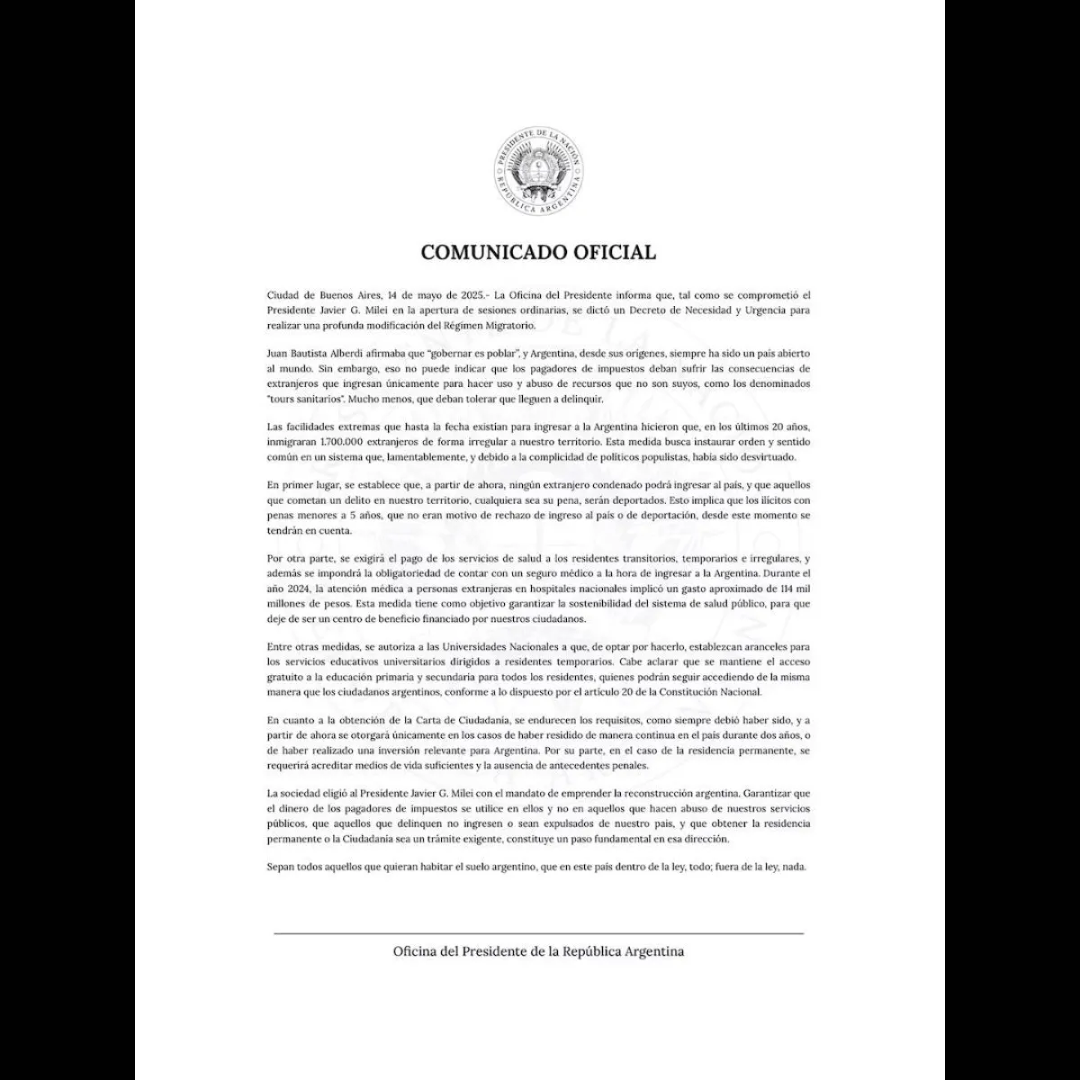 El Gobierno de Javier Milei dio a conocer su nueva reforma migratoria, que busca modificar los requisitos para la obtención de la residencia por parte de extranjeros y establecer un mecanismo de deportación acelerada. El anuncio fue realizado por el vocero presidencial, Manuel Adorni, quien comunicó que la medida se implementará a través de un Decreto de Necesidad y Urgencia (DNU), que se publicará en el Boletín Oficial en los próximos días.