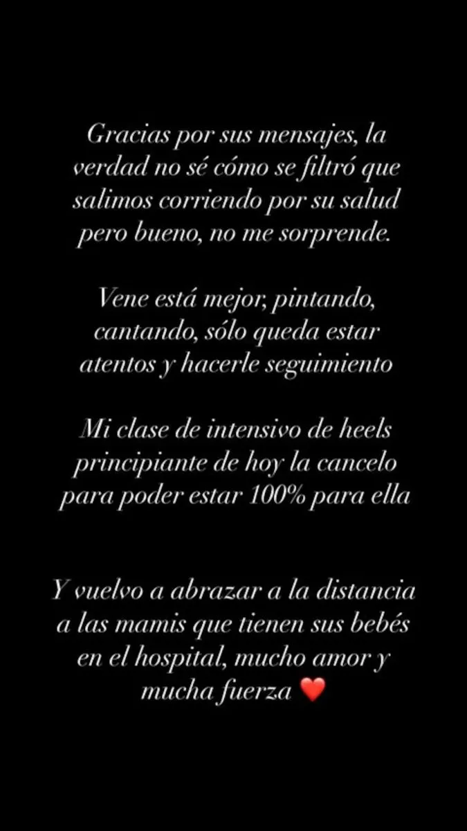La bailarina agradeció el apoyo recibido: “Gracias por sus mensajes, la verdad no sé cómo se filtró que salimos corriendo por su salud, pero bueno, no me sorprende.” Y agregó: “Vene está mejor, pintando, cantando, solo queda estar atentos y hacerle seguimiento.”