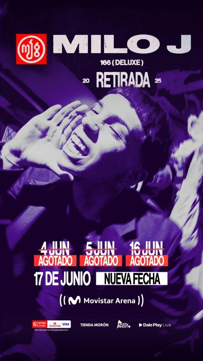 Después de un concierto gratuito que no llegó a concretarse en la ex-ESMA, Milo J sorprendió a sus seguidores con la noticia de su regreso a los escenarios porteños. Inicialmente anunció dos fechas para el 4 y 5 de junio, que se agotaron en pocas horas.