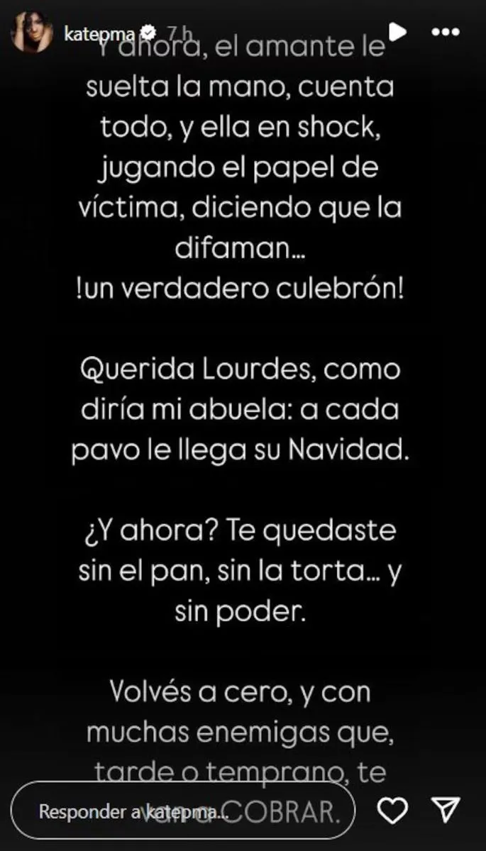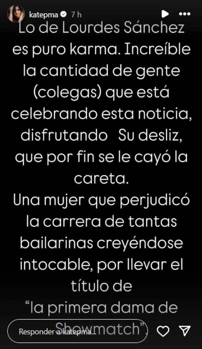 “Lo de Lourdes Sánchez es puro karma. Increíble la cantidad de gente (colegas) que está celebrando esta noticia, disfrutando su desliz, que por fin se le cayó la careta”, escribió Kate en sus historias, dejando en evidencia viejos rencores.