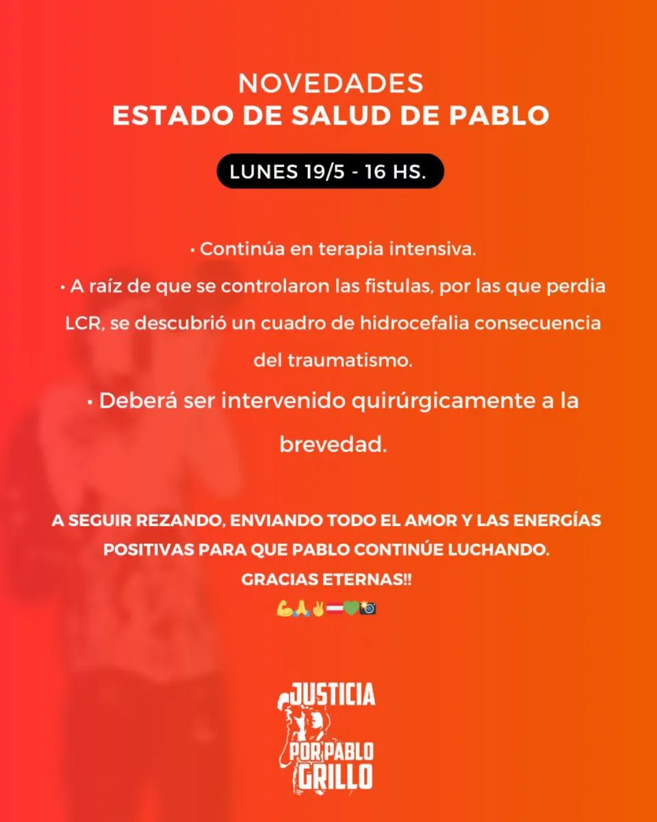 A través de la cuenta de X en la que se actualiza su estado de salud, sus familiares compartieron el mensaje: “A seguir rezando, enviando todo el amor y las energías positivas para que Pablo continúe luchando”. La publicación acompañó el último parte médico que confirmó el diagnóstico de hidrocefalia, producto del traumatismo sufrido.