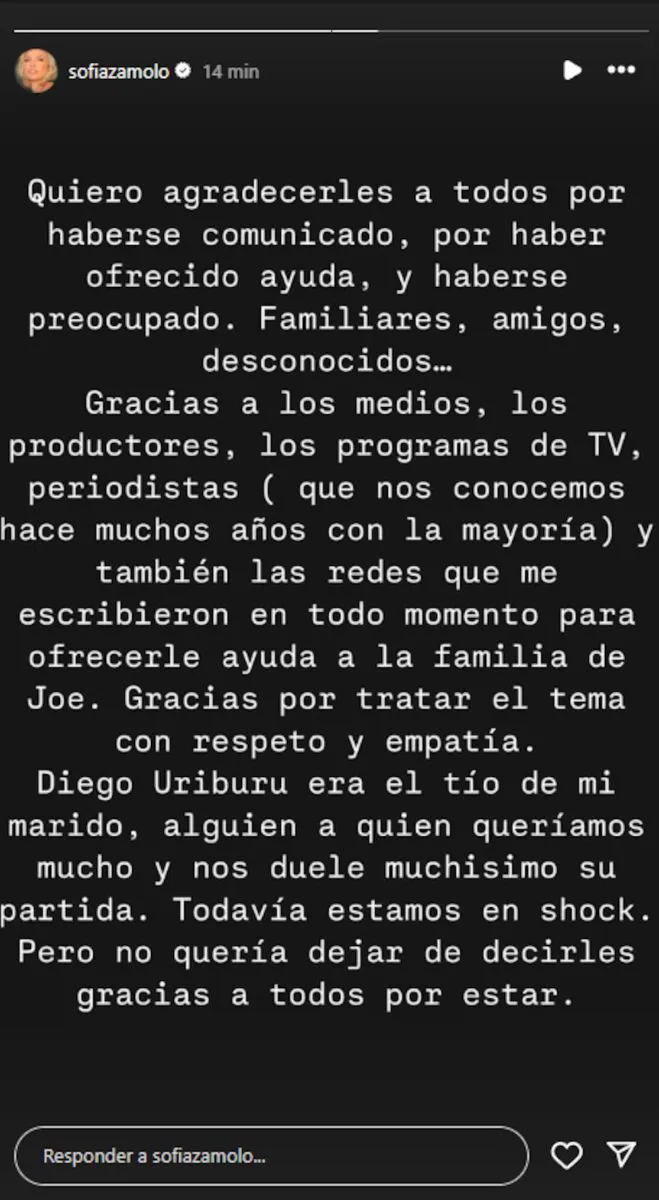 También dedicó unas palabras a quienes cubrieron la noticia: “Gracias a los medios, los productores, los programas de TV, periodistas (que nos conocemos hace muchos años con la mayoría) y también las redes que me escribieron en todo momento para ofrecerle ayuda a la familia de Joe. Gracias por tratar el tema con respeto y empatía”.