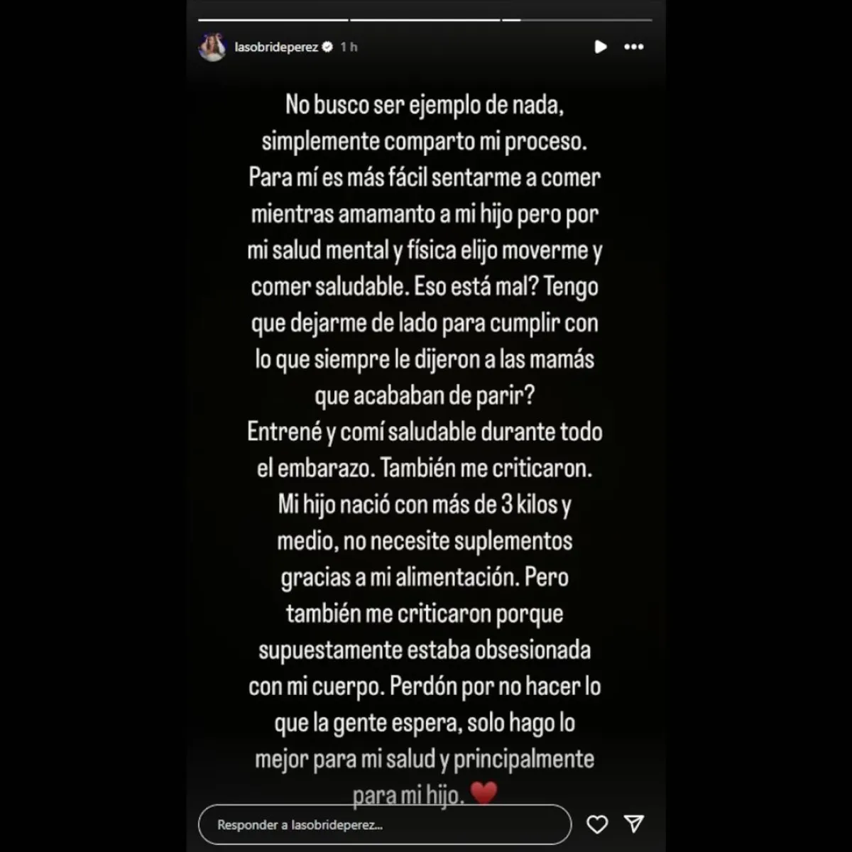 Finalmente, Pérez se refirió a los señalamientos sobre su atención a lo estético. “También me criticaron porque supuestamente estaba obsesionada con mi cuerpo”, comentó, dejando entrever la incomprensión que aún existe en torno al autocuidado materno. Cerró su mensaje con una declaración contundente: “Perdón por no hacer lo que la gente espera, solo hago lo mejor para mi salud y principalmente para mi hijo”.