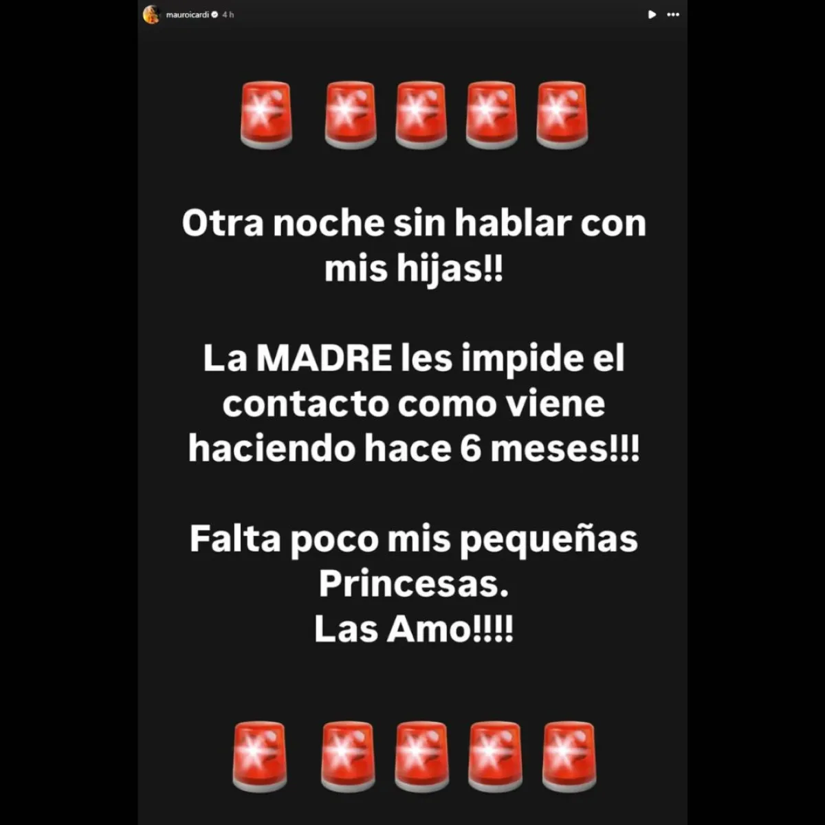 “¡¡Otra noche sin hablar con mis hijas!! La MADRE les impide el contacto como viene haciendo hace 6 meses. Falta poco mis pequeñas Princesas. Las Amo”, escribió Icardi, utilizando un fondo negro con letras blancas y acompañado de varios emojis de sirenas de emergencia, lo que le dio a su mensaje un tono de urgencia y desesperación. La publicación se realizó alrededor de la 1:30 de la madrugada en Turquía, donde el jugador reside actualmente.