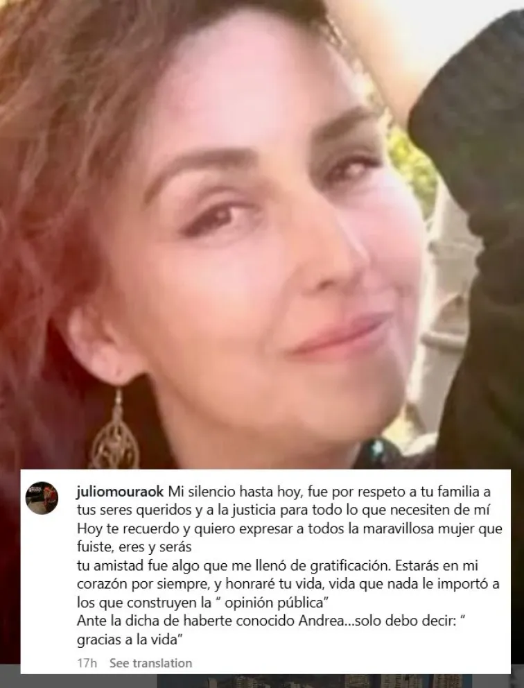 "Mi silencio hasta hoy fue por respeto a tu familia, a tus seres queridos y a la Justicia para todo lo que necesiten de mí", escribió Moura junto a una foto de Andrea. "Hoy te recuerdo y quiero expresar a todos la maravillosa mujer que fuiste, eres y serás. Tu amistad fue algo que me llenó de gratificación. Estarás en mi corazón por siempre, y honraré tu vida, vida que nada le importó a los que construyen la opinión pública", añadió.