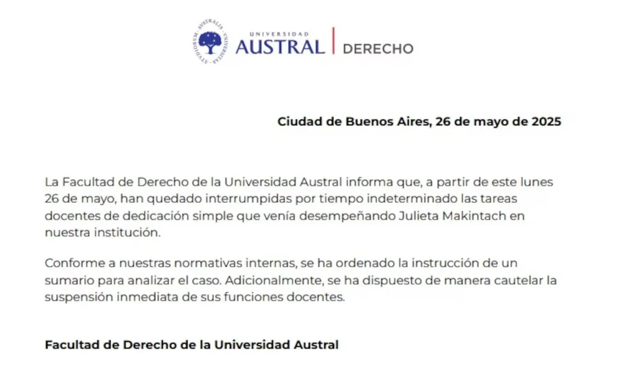 A través de un comunicado oficial, la universidad informó: “A partir de este lunes 26 de mayo, quedaron interrumpidas por tiempo indeterminado las tareas docentes de dedicación simple que venía desempeñando Julieta Makintach en nuestra institución”.