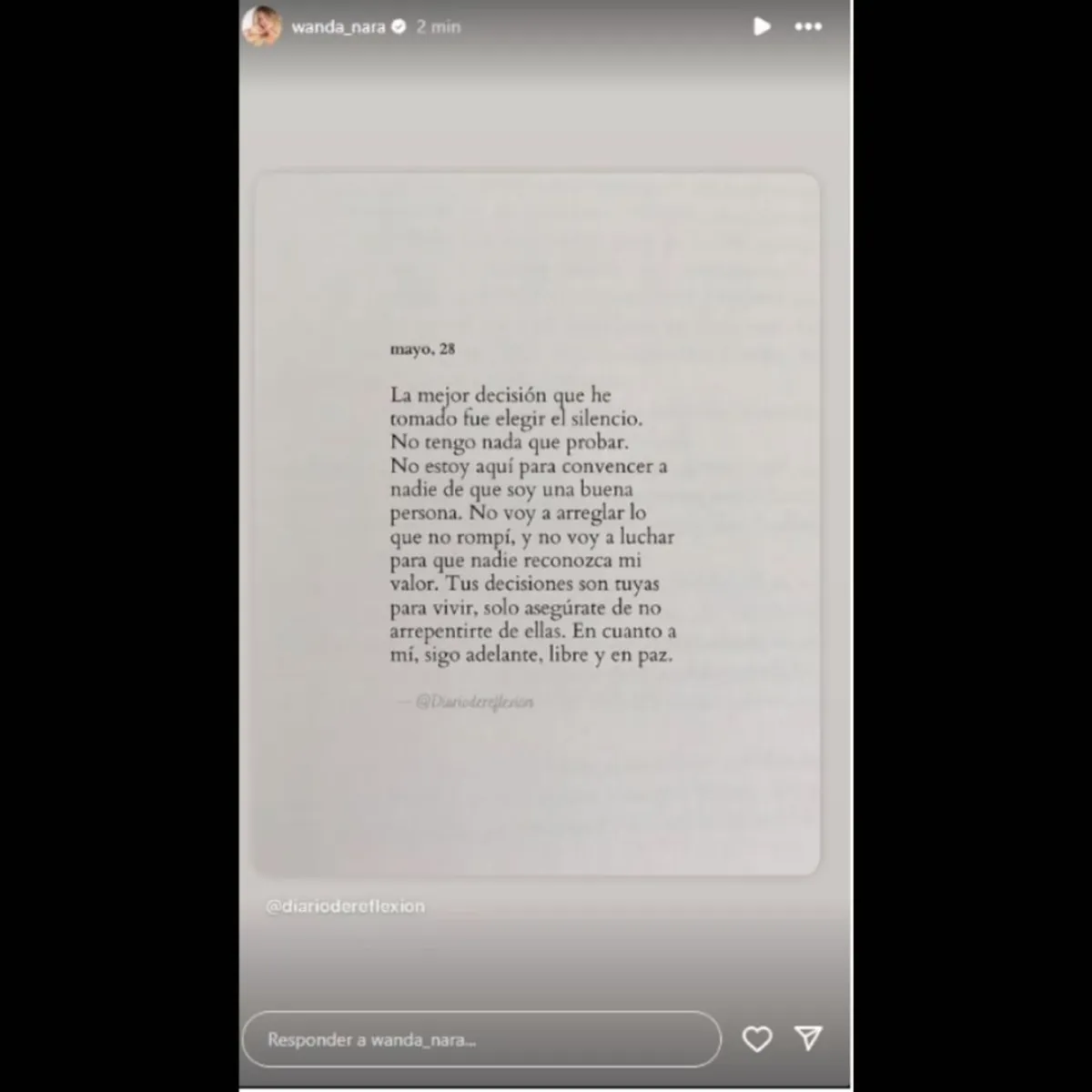 “La mejor decisión que he tomado fue elegir el silencio”, se lee en la frase que tomó de una cuenta llamada Diario reflexión, dejando entrever su deseo de mantenerse serena y evitar confrontaciones públicas. El posteo también incluyó una afirmación que marcó su posición con firmeza: “No tengo nada que probar, no tengo que convencer a nadie de que soy buena persona”.
