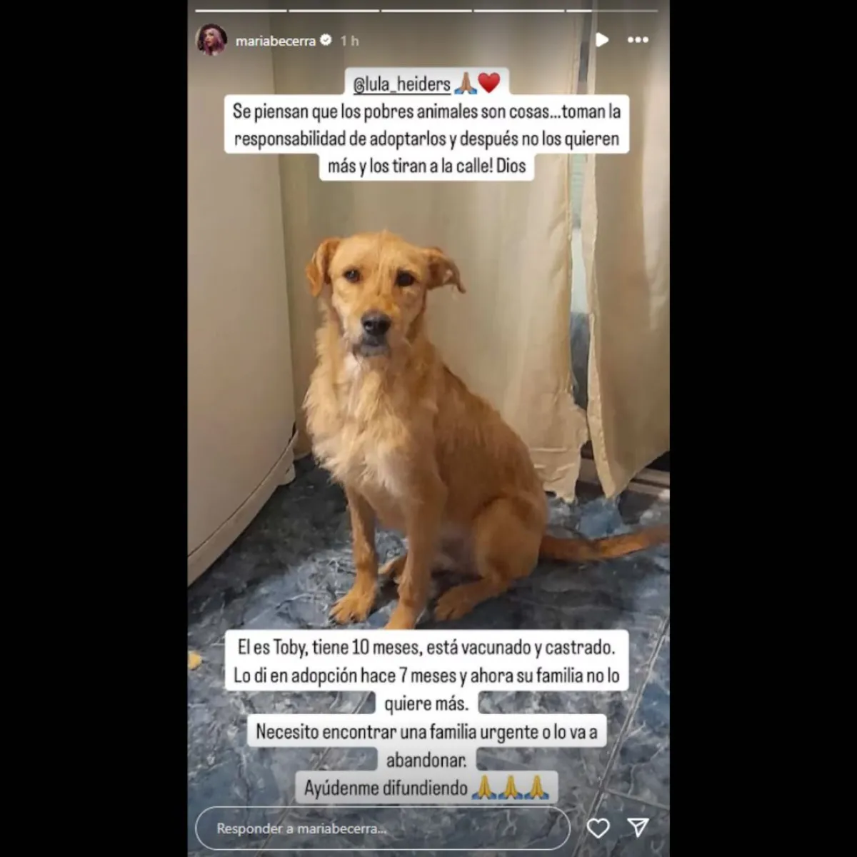Conmovida, María lo compartió en sus historias de Instagram junto a una frase contundente: “Se piensan que los pobres animales son cosas. Toman la responsabilidad de adoptarlos y después no los quieren más y los tiran a la calle”.