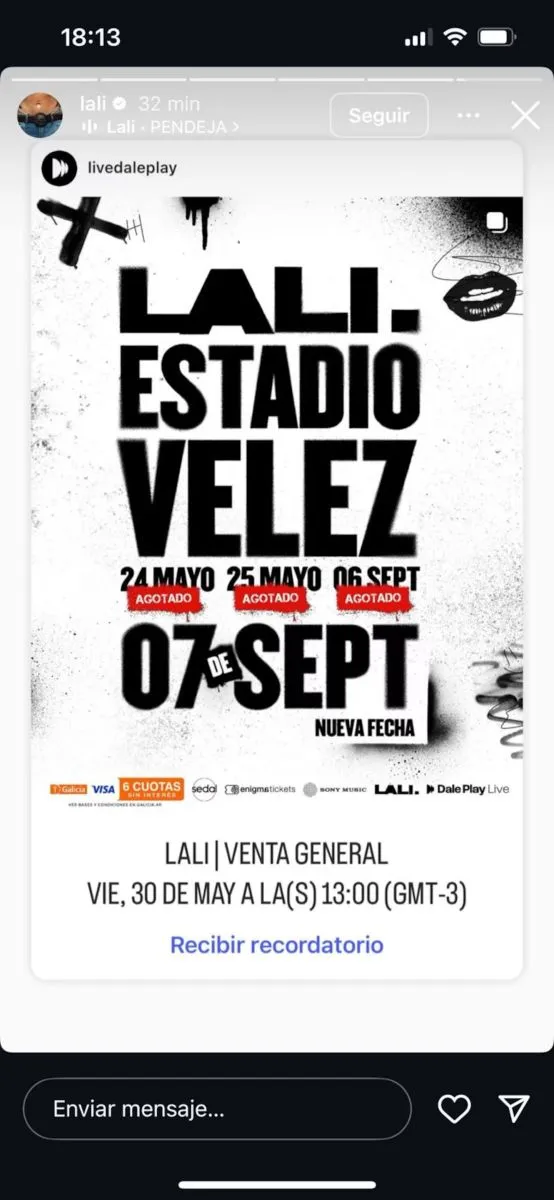La noticia fue confirmada por la propia Lali en sus redes, donde compartió su emoción: “No puedo creer lo que está pasando”, escribió. Y añadió: “Cuatro Vélez en un año. Esto es porque hicieron un quilombo bárbaro, porque son un público increíble. Gracias, no sé cómo agradecer esta locura”.