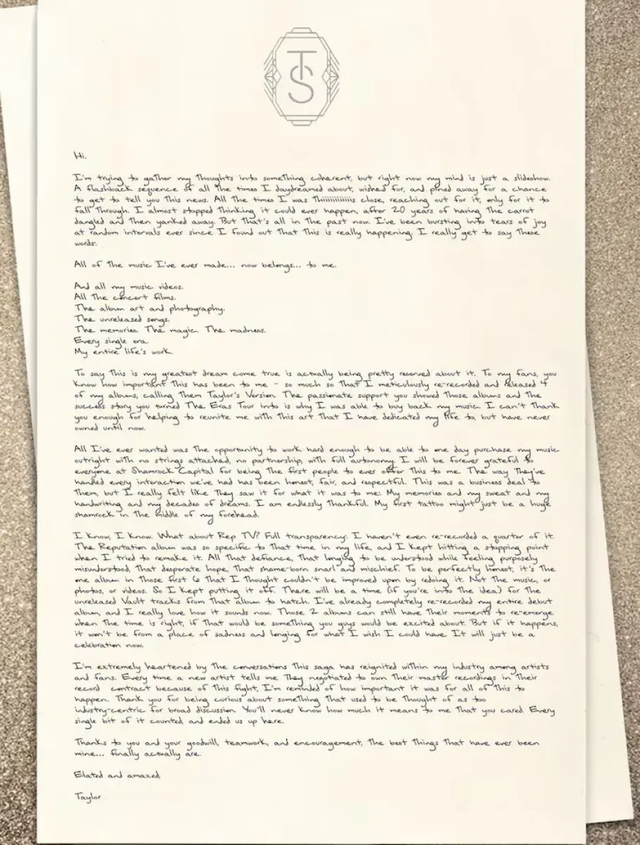 Según Billboard, la cantante pagó alrededor de 360 millones de dólares por sus masters. En su carta, Swift expresó: "Para ellos era un acuerdo comercial, pero realmente sentí que lo veían como lo que era para mí: mis recuerdos, mi sudor, mi letra y mis décadas de sueños".